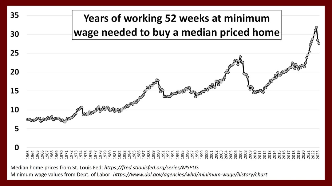 50 years ago it took about 7 years working at minimum wage to afford an average home.